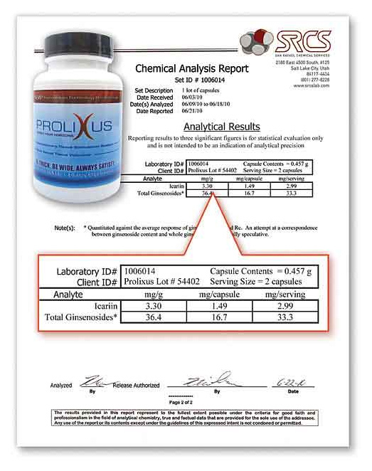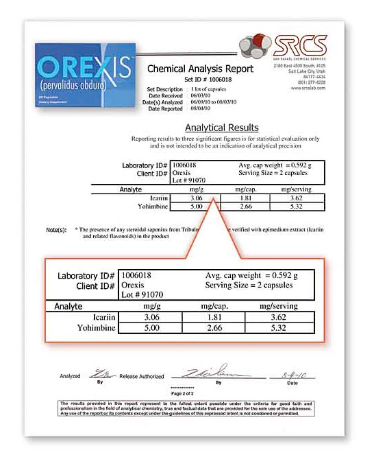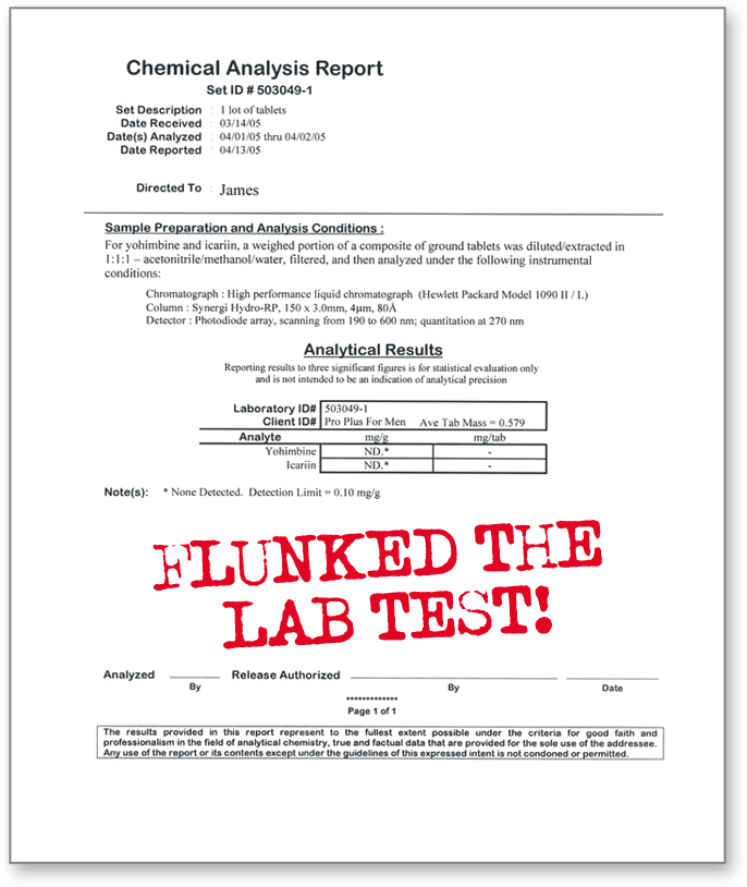 This should not come as much of a shock. The lab reports reveals that this powdered formula that is supposed to create a miracle, is basically worthless powder. Probably rice powder. This is the definition of a scam.This test examined the level of Yohimbine and Icariin (the active component of Horny Goat Weed.) The ND means that None Detected. And this sophisticated test can detect levels as low as 0.10 mg. So there is zero yohimbine and zero horny goat weed in these pills. The label claims there is 100 mg of each ingredient.