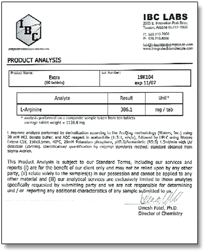 I only had Extra tested for L-Arginine. The label claims 750 mg of L-Aginine per serving and the tests show that it has about half of that with 386 mg per serving. It is off by about 50%. But what is really interesting is if you compare these levels with some of the others in the Scam Section. Procylon lab test which showed it contains less than 6 mg of L-Arginine or Maxoderm which was 0 mg L-Arginine or Magna Rx which had about 84 mg, compared to those pills Extra seems like a champion. It is not, it is the best of the worst.