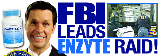 50 AGENTS FROM THE FBI, U.S. POSTAL SERVICE, FDA AND VARIOUS POLICE AGENCIES CONDUCT A MASSIVE THREE LOCATION RAID OF THE ENZYTE OFFICES, BANK ACCOUNTS ARE FROZEN AS SEALED SEARCH WARRANT, AUTHORIZED BY A FEDERAL JUDGE, SIGNALS FUTURE INDICTMENTS SAY EXPERTS.