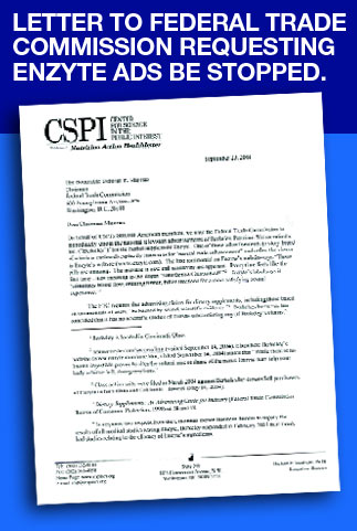 The Center for Science in the Public Interest (CPSI), wrote a letter to Deborah Majoras the Chairman of the Federal Trade Commission asking on behalf of CSPI’s 800,000 members requesting the FTC to instantly enjoin the national TV advertisements for Enzyte since they are such a massive consumer fraud. CPSI notes that the company behind Enzyte has ZERO scientific studies to support the claims made about Enzyte.
