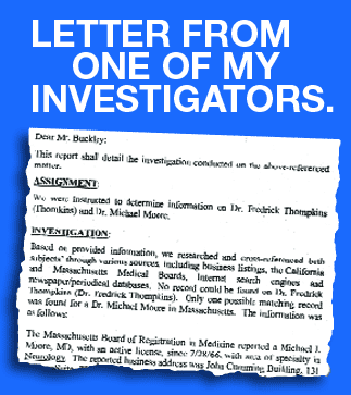 After I searched everywhere to find Dr. Frederick Thompkins and Dr. Michael Moore, and couldn’t find a thing, I decided to get professional health. I hired two separate private investigators to try and track down the two doctors mentioned in the Enzyte ad, as having developed Enzyte. Guess what? According to two different investigators, neither of these doctors appear to exist. They just made them up out of thin air.