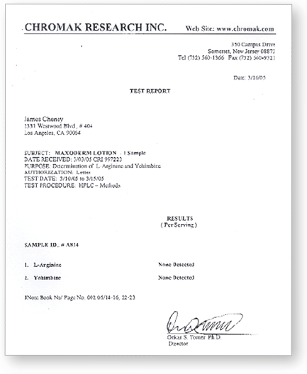 This independent laboratory report shows that Maxoderm is a scam. It was atested for L-Arginine, yohimbe, and tribulus terrestris. The report shows itcontains not even a trace of these ingredients claimed to be in the product.